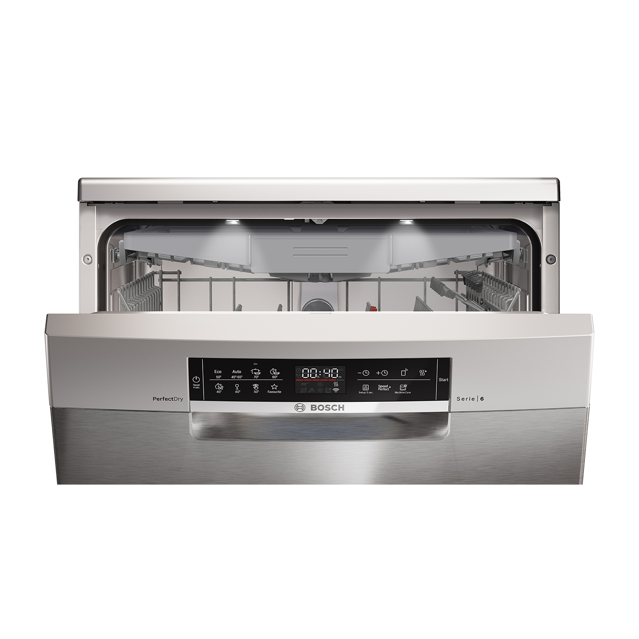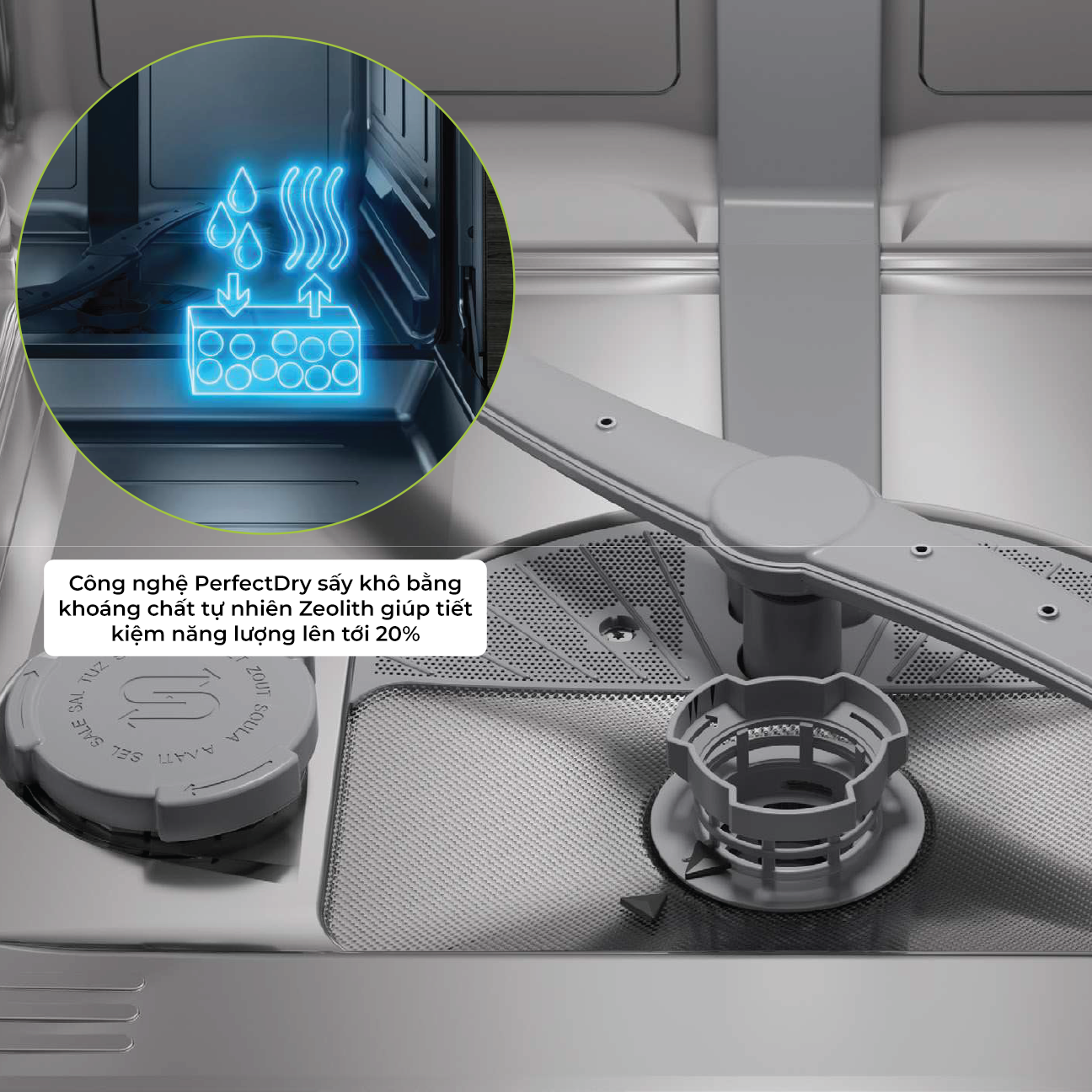 Điểm nhấn công nghệ của model này là công nghệ sấy Zeolith® độc quyền. Sử dụng các hạt khoáng chất tự nhiên, Zeolith hấp thụ hơi ẩm và chuyển hóa thành luồng khí nóng, giúp sấy khô hoàn hảo mọi loại vật dụng, kể cả đồ nhựa, mà không tốn thêm điện năng. Chén đĩa sau khi rửa không chỉ sạch bóng mà còn khô cong, sẵn sàng để sử dụng ngay hoặc cất vào tủ.